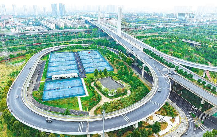 10月16日,鸟瞰武汉市洪山区凤凰路与杨四港高速交叉口桥下运动场地(约3万平方米)。场地内设有足球场、网球场等设施设备。足球场正式向公众开放。靠近铁路,废弃多年的桥下广场经过精心整修,改造成全民体育空间。 (湖北日报全媒体记者 朱西勇 提供)