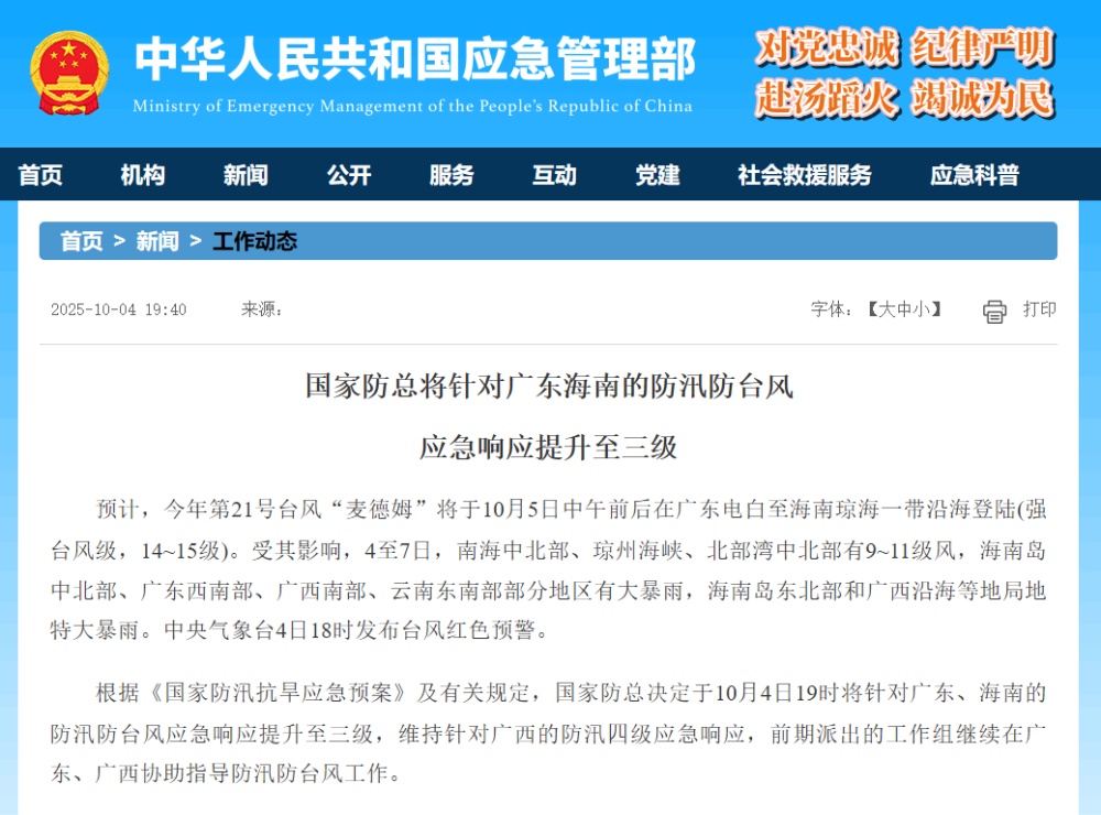 预计今年的台风21将于10月5日中午(台风级别,14-15级)左右登陆广东话的Diambai海岸。在4到7的影响下,中国南部的中心和北部有风,Qiongzhou海峡和Beibu湾北部的海峡从9到11个级别。中央和北部的海南岛,东,西部和西南部以及云南省都有严重的暴风雨。海南(Hainan)东北岛和广州海岸有强风暴。中央气象天文台在下午6点发布了红师高原警告。房间。根据“国家紧急洪水管理和救济的国家计划”和相关法规,国家洪水管制委员会已决定对广东的第四级洪水控制对待。在早期寄来的工作组继续支持和指导控制洪水,并预防广东和广州的泰芙人。网站屏幕截图